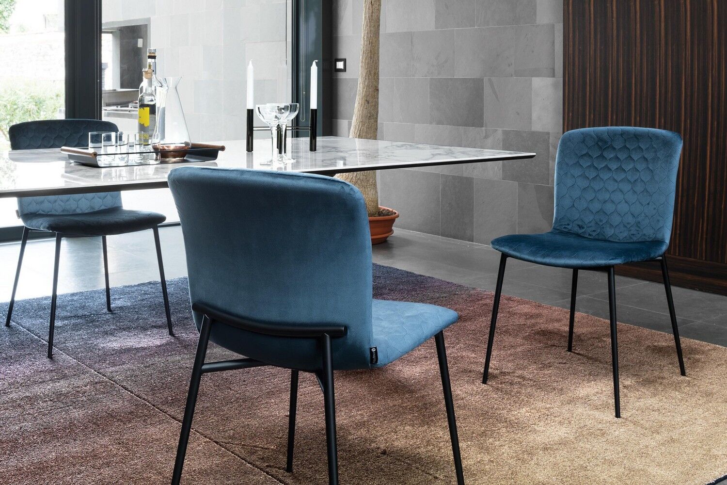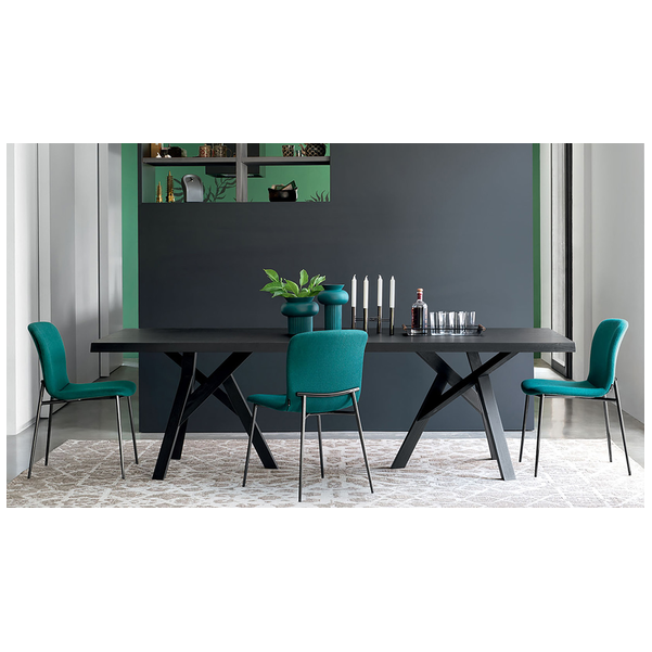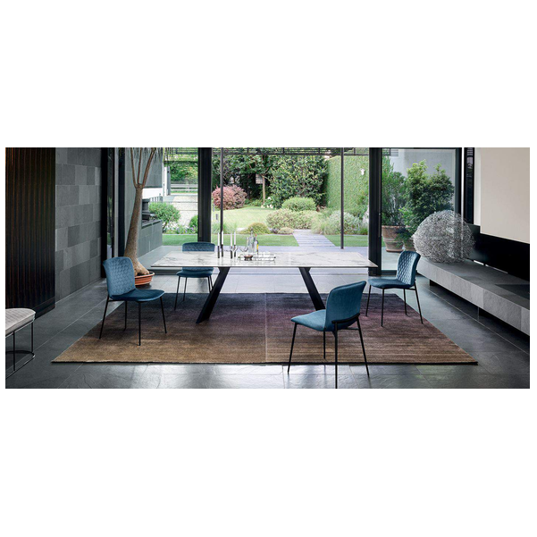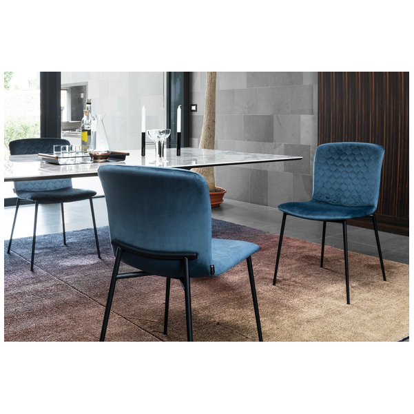 Love jest częścią nowej serii wyściełanych krzeseł o delikatnie wyrzeźbionej sylwetce i nieco vintage'owym klimacie. Charakterystycznym detalem łączącym wszystkie elementy kolekcji jest element na oparciu, który jest eleganckim przedłużeniem metalowych nóg. Ten uderzająco stylowy element świadczy o niekonwencjonalnym wzornictwie między siedziskiem z tkaniny, a ramą nośną. Jego miękka wyściółka i wyrafinowane detale na metalowej ramie sprawiają, że krzesło Love staje się luksusem na co dzień.