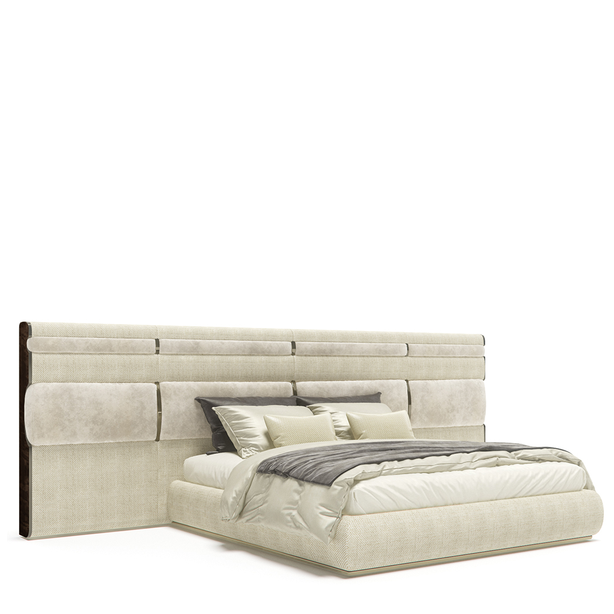 Trilogy to system, który w unikalny i wyrafinowany sposób wyposaża miejsce odpoczynku. Szereg paneli podzielonych metalowym profilem łączy się, tworząc zagłówek, który można dostosować z różnych tkanin i skór. Drewniana rama. Nieodkształcalna pianka poliuretanowa o różnej gęstości.