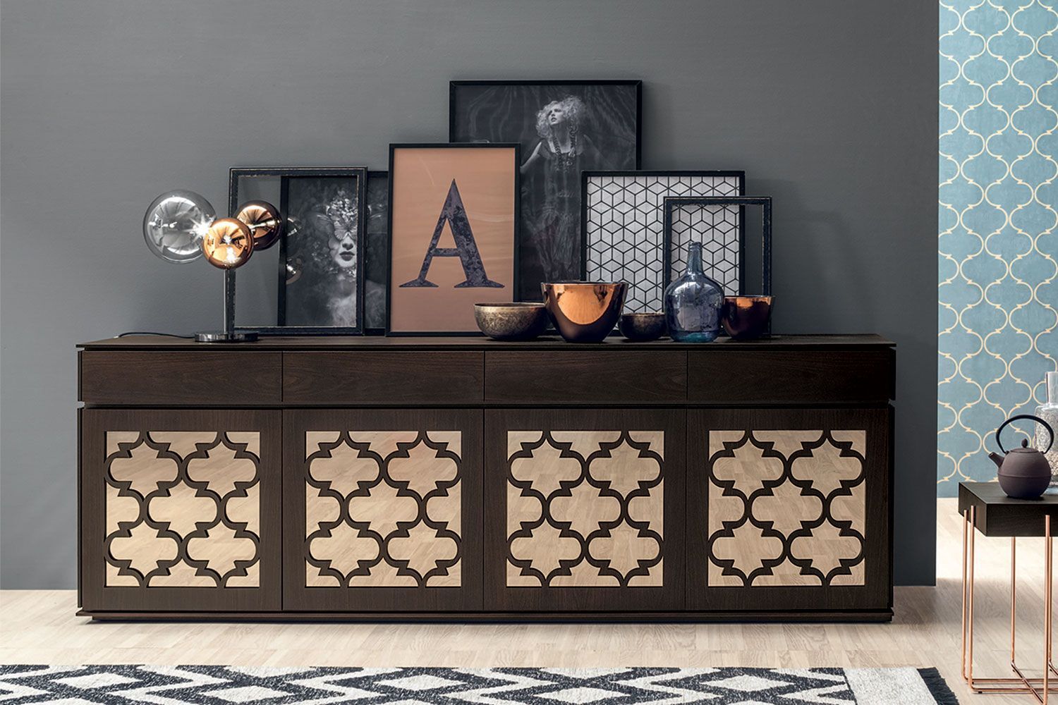 Prezentacja Marrakesh firmy Tonin Casa jest idealna do obszarów wymagających ekspozycji i przechowywania. Wycięcia na drzwiach przyciągają wzrok i sprawiają, że jest to piękny punkt centralny w nowoczesnym domu. Dzięki mocnym i solidnym półkom jest wystarczająco dużo miejsca na elegancką porcelanę i inne przedmioty, wszystko z łatwością pomieści. Wyeksponowanie elementów wystroju domu na górze dodaje gustu. Wyprodukowana we Włoszech w celu zapewnienia jakości, dostępnych jest kilkanaście konfiguracji, a opcjonalne światło LED z pilotem lub bez. Struktura jest dostępna w różnych wykończeniach drewnopodobnych, a panel tylny może pasować do drewna lub mieć brązowe lustrzane wykończenie.