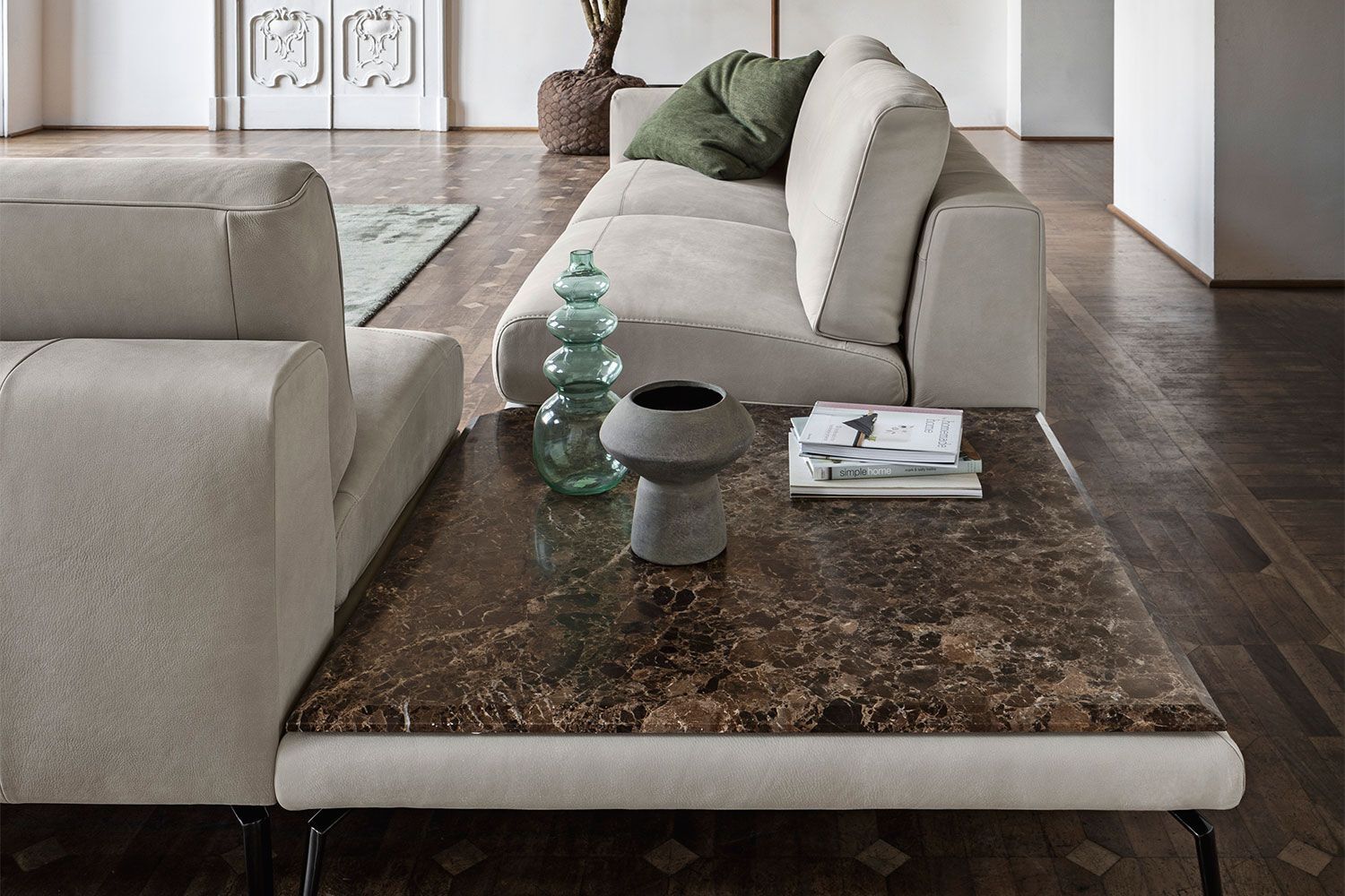 Minimalistyczna sylwetka nadaje pomieszczeniu ponadczasowego wyglądu i dobrze komponuje się z resztą współczesnych mebli. Dzięki misternym przeszyciom na podłokietnikach i poduszkach tworzy wzór w paski, który przyciąga wzrok. Luksusowo miękka tapicerka i wyściełana wyściółka zapewniają komfort przez wiele godzin, co czyni go jednym z najlepszych siedzeń w domu. Dostępna w wersji ze skóry i tkaniny.