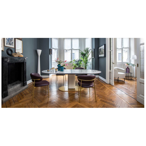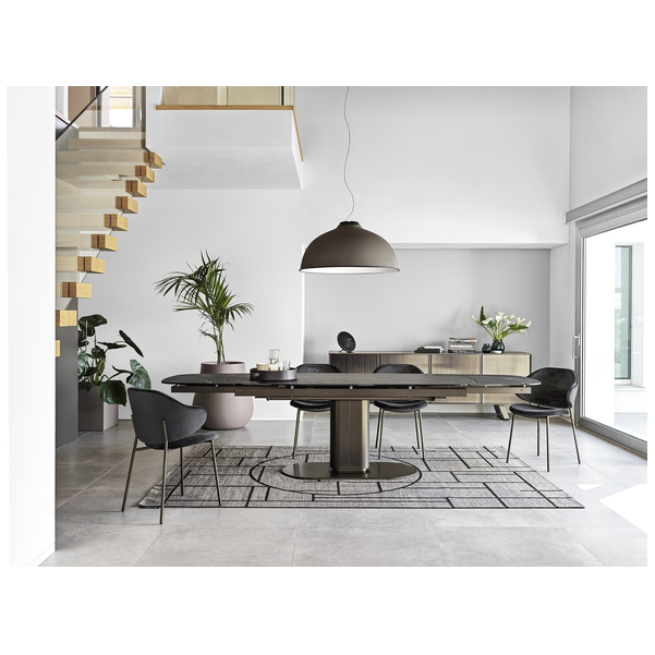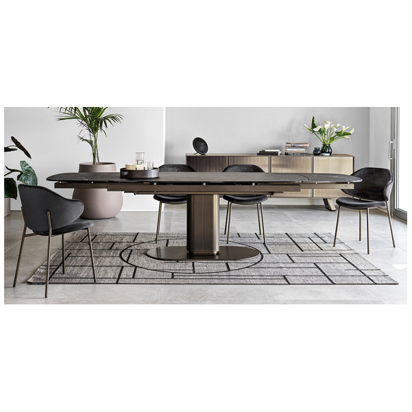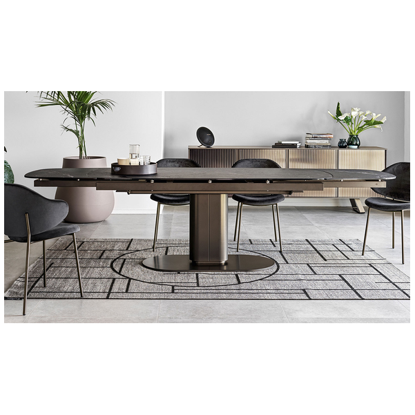 Cameo stół o ostro zarysowanej owalnej sylwetce, która nadaje mu silną osobowość i nie tylko zapewnia stabilność, ale pozwala maksymalnie wykorzystać przestrzeń pod blatem. Wykonana z powlekanego metalu kolumna centralna obsługuje różne typy blatów; połączenie metalu i drewna jest niezmiennie wyrafinowane, podczas gdy mieszanka metalu i ceramiki z efektem marmuru tworzy kontrast między zimnymi i ciepłymi materiałami i jest niesamowicie nowoczesna.