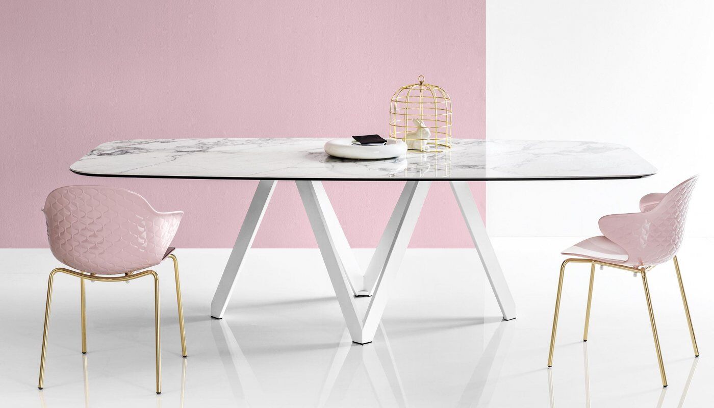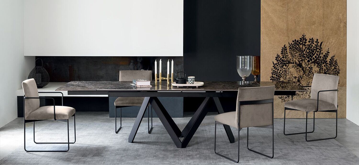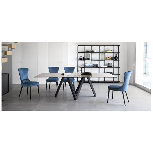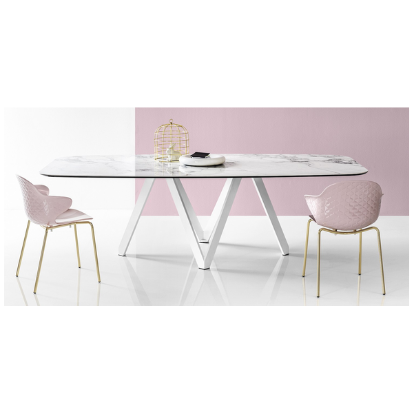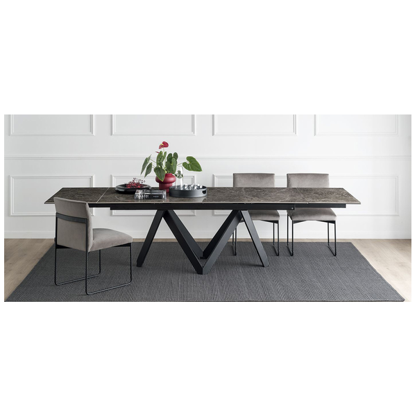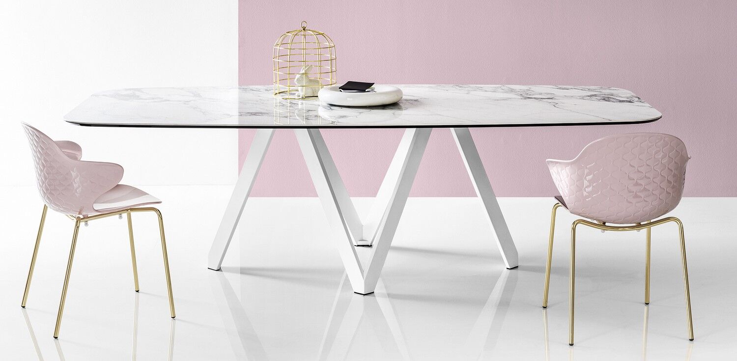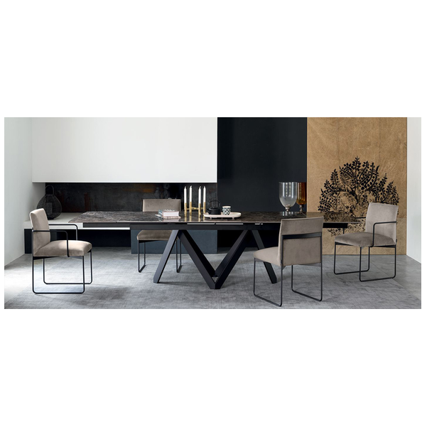Stół Cartesio ma eleganckie, kultowe linie charakteryzujące się oryginalną ramą nośną z malowanego metalu, złożoną z czterech niezależnych prostokątnych elementów w kształcie litery „V”. Blat jest dostępny z ceramiki szklanej lub drewna. Rzeźbiarski i nowoczesny, swoimi mocnymi cechami podkreśli nawet najbardziej klasyczne i skrupulatne pomieszczenie.