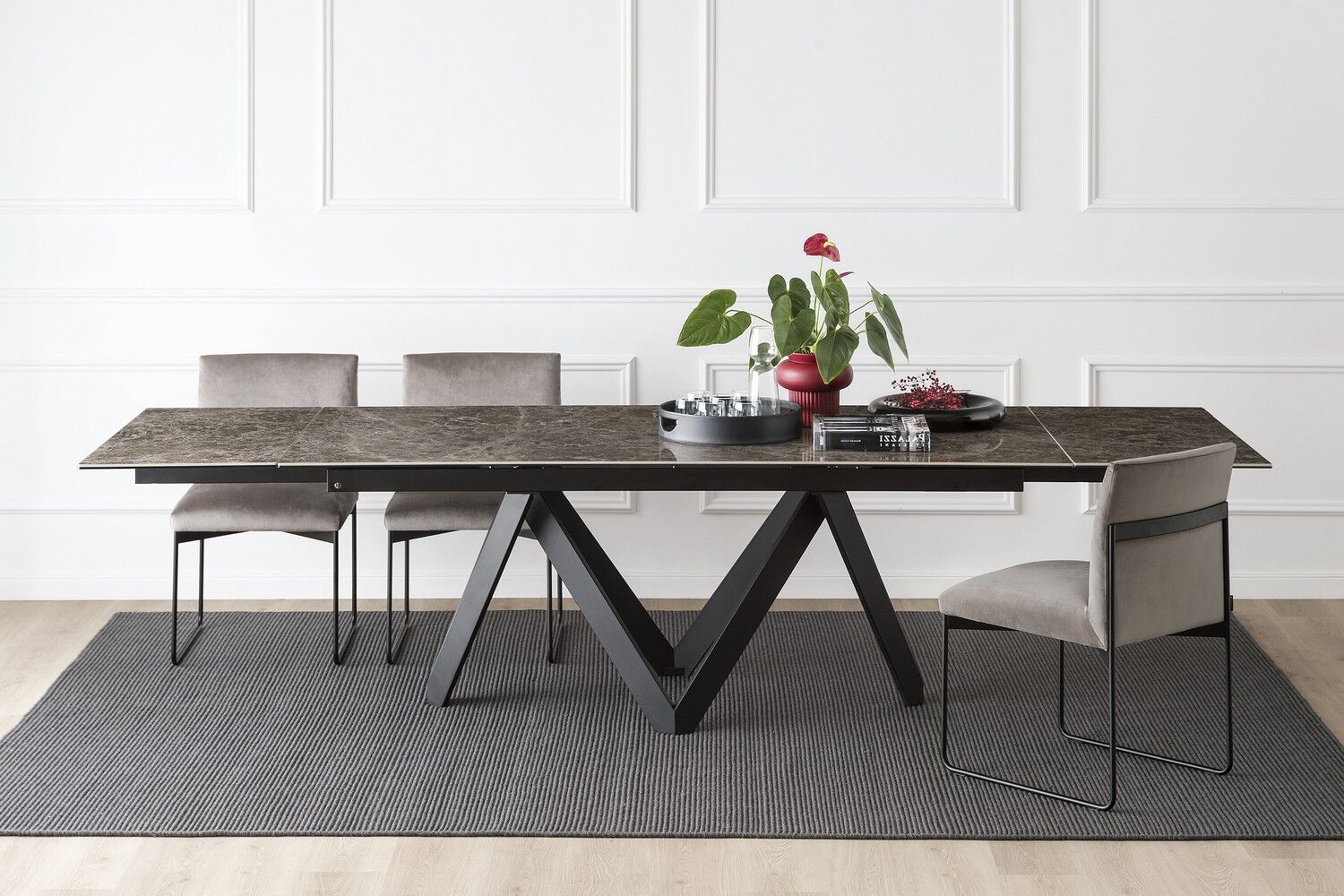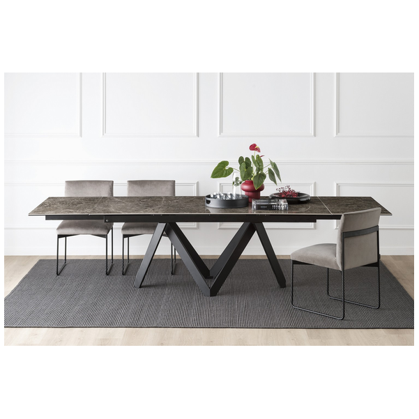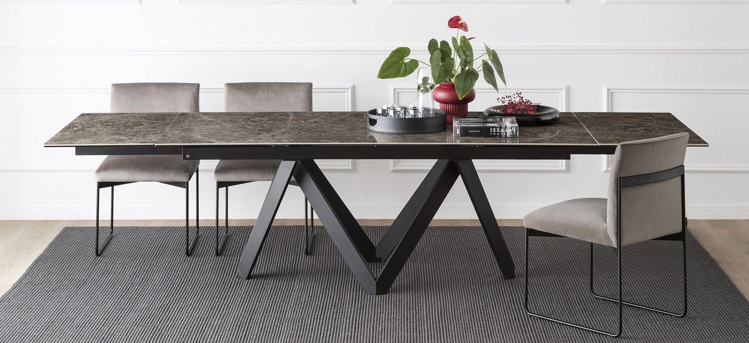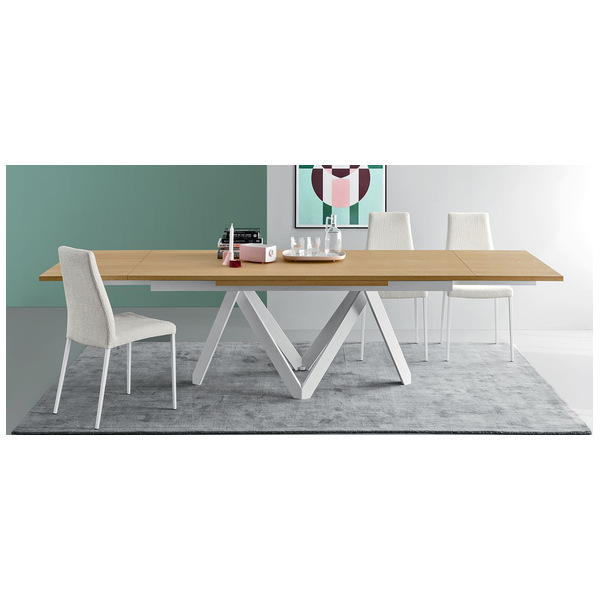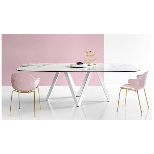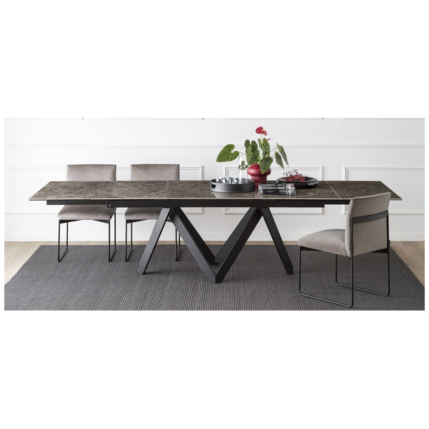 Stół Cartesio ma eleganckie, kultowe linie charakteryzujące się oryginalną ramą nośną z malowanego metalu, złożoną z czterech niezależnych prostokątnych elementów w kształcie litery „V”. Blat jest dostępny z ceramiki szklanej lub drewna. Rzeźbiarski i nowoczesny, swoimi mocnymi cechami podkreśli nawet najbardziej klasyczne i skrupulatne pomieszczenie.