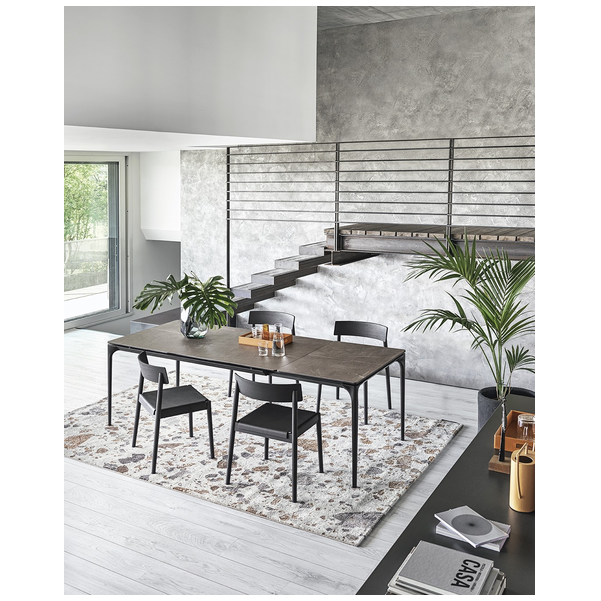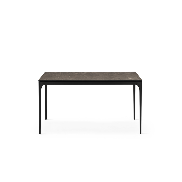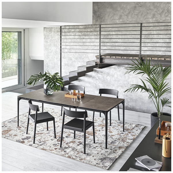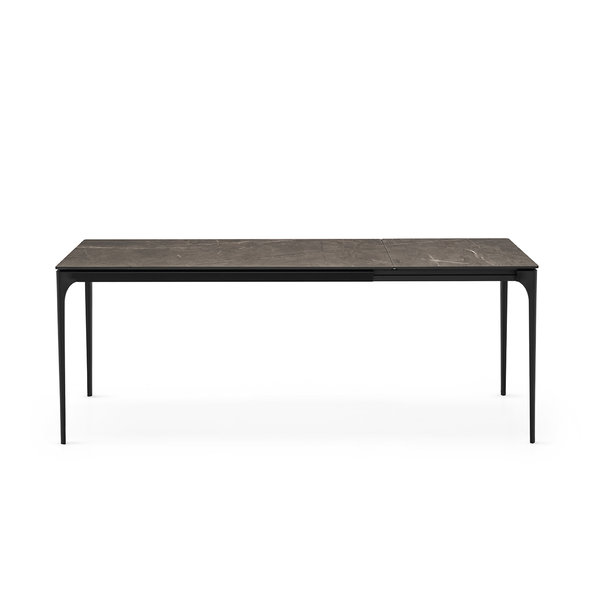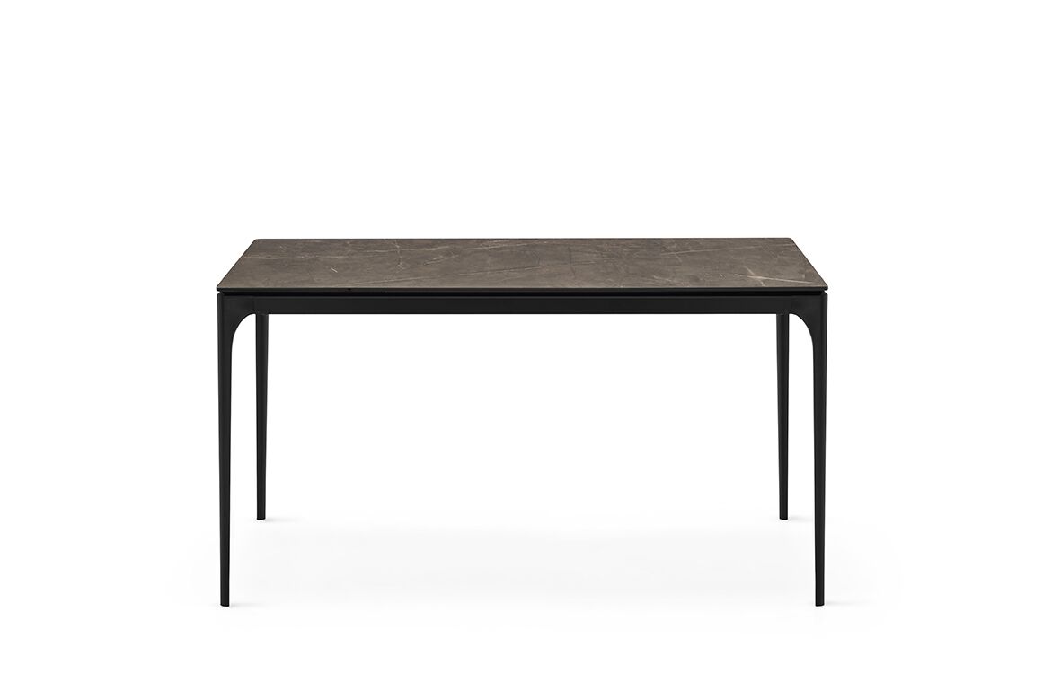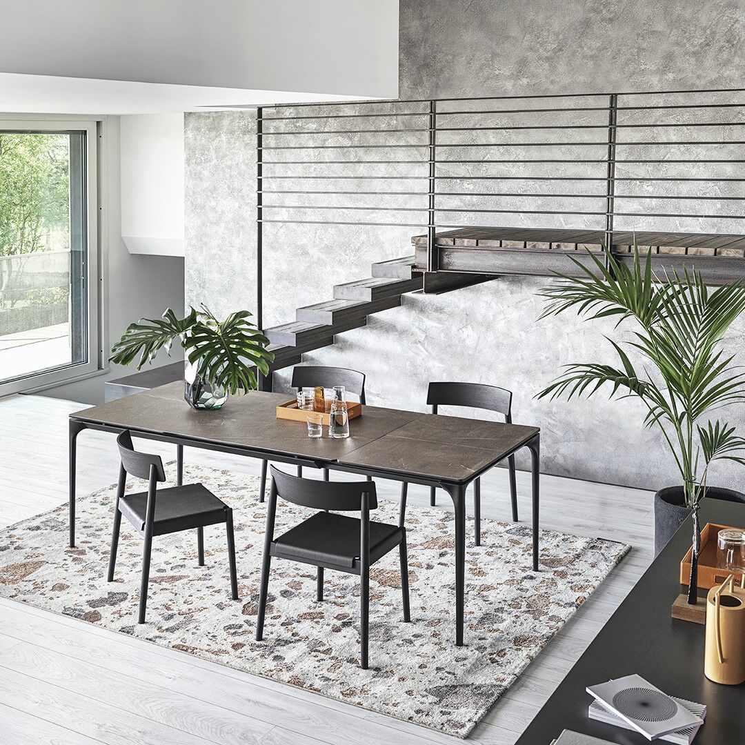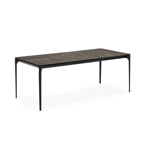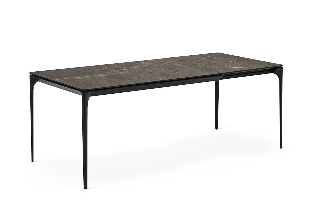 Silhouette to rozkładany stół o wyrafinowanym minimalistycznym designie, miękko zaokrąglonych krawędziach i smukłej ramie z powlekanego aluminium z blatem dostępnym zarówno z drewna, jak i ceramiki. Mechanizm składanego skrzydła jest wykonany z tego samego materiału co blat.