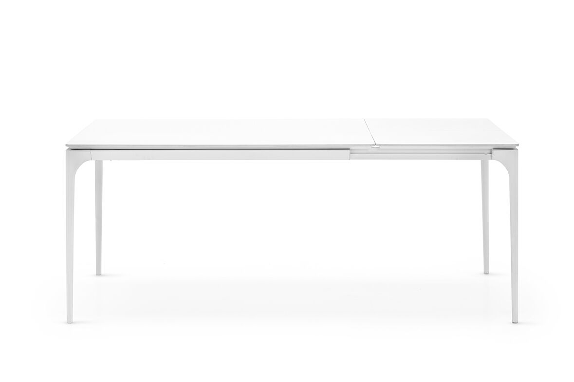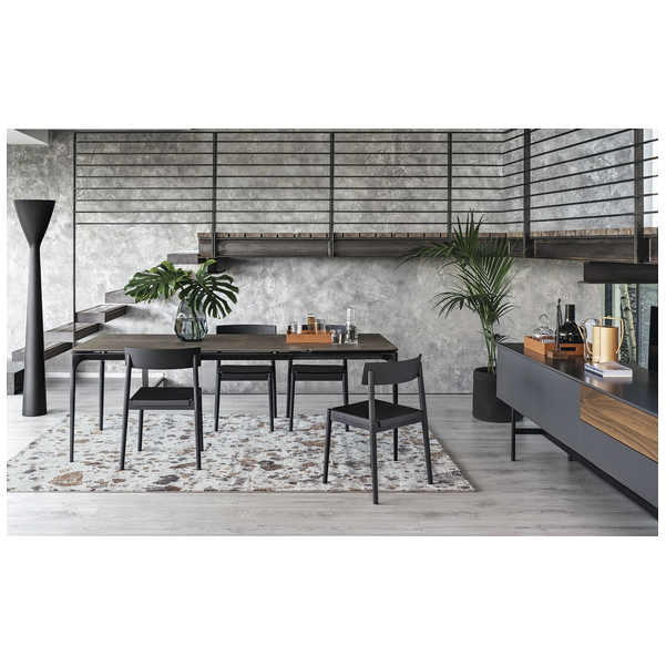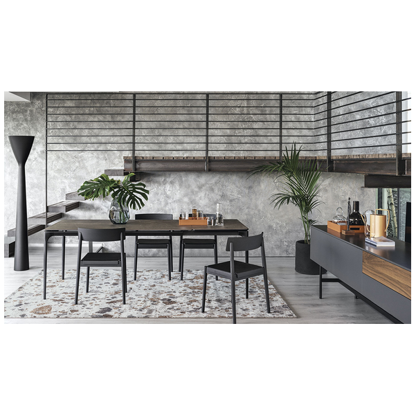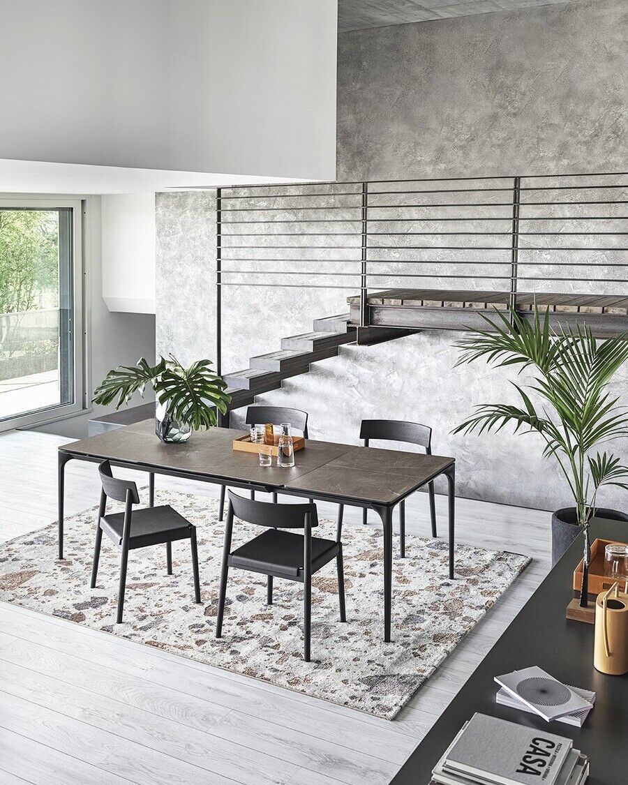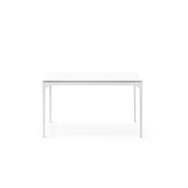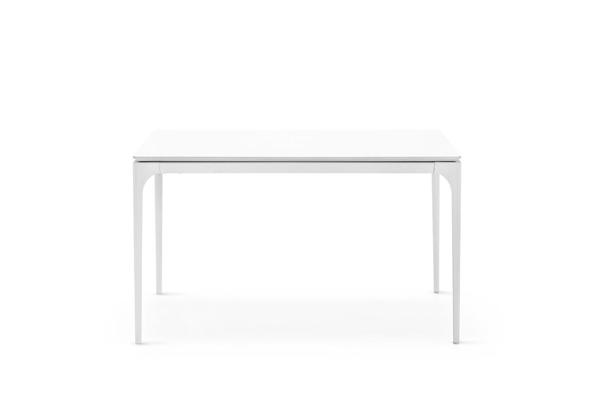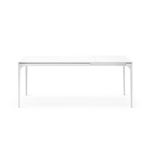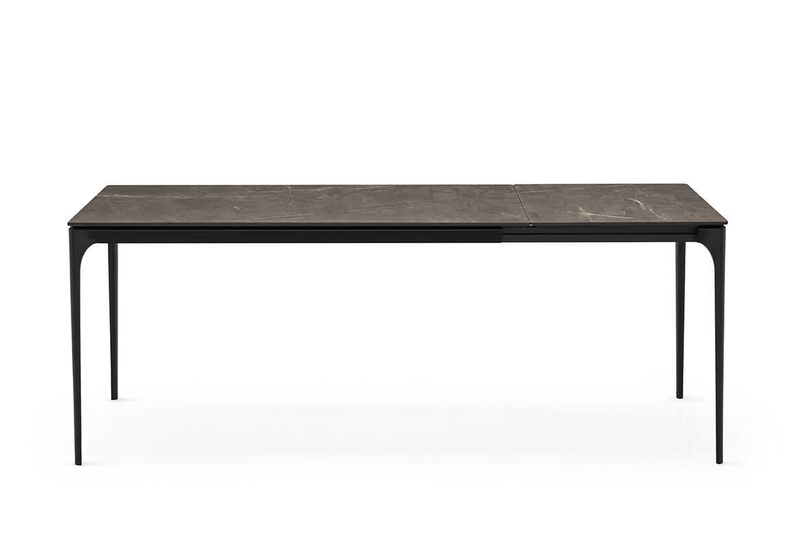 Silhouette to rozkładany stół o wyrafinowanym minimalistycznym designie, miękko zaokrąglonych krawędziach i smukłej ramie z powlekanego aluminium z blatem dostępnym zarówno z drewna, jak i ceramiki. Mechanizm składanego skrzydła jest wykonany z tego samego materiału co blat.